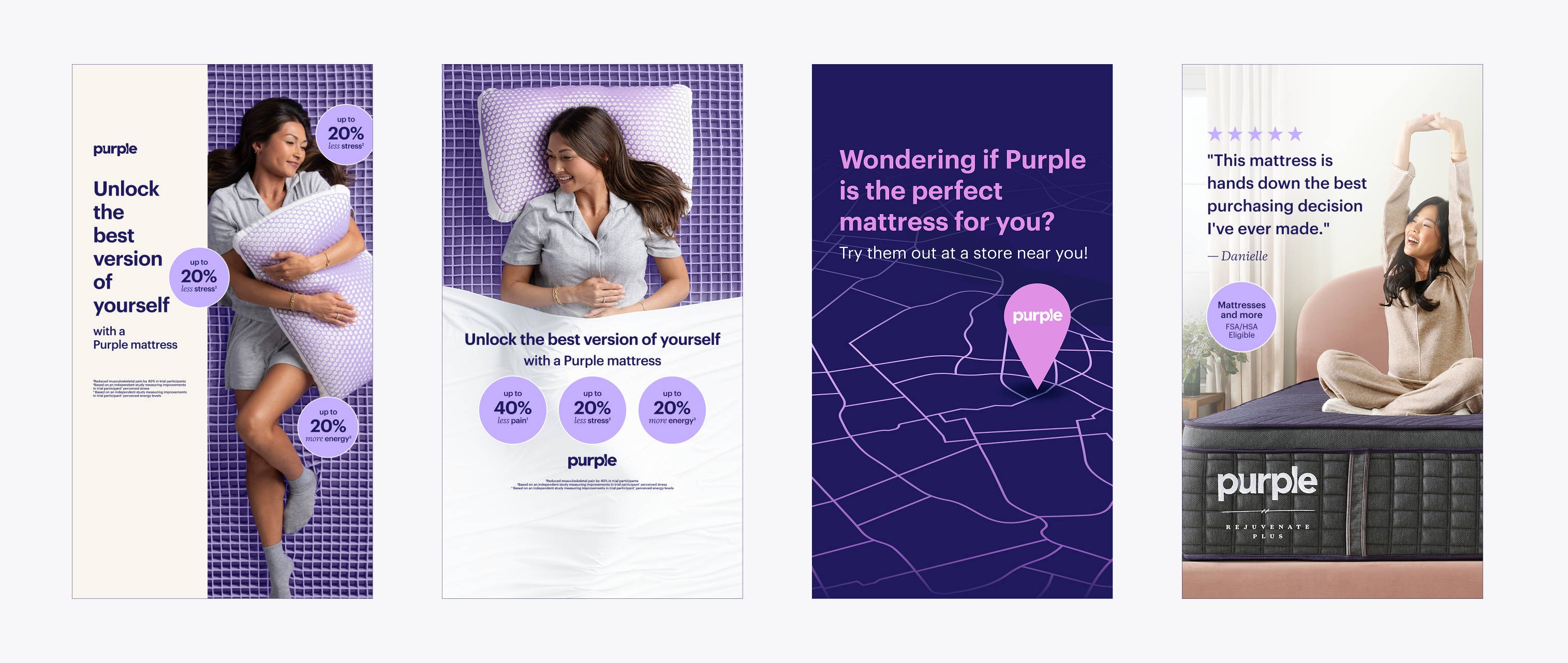 - One of my responsibilities at Purple is to develop high-impact static and motion paid media ads across Meta, Snapchat, Pinterest, and Reddit. These campaigns highlight current promotions, evergreen brand messaging, and drive-to-store initiatives. Through ongoing testing and optimization, my creative work has consistently improved performance metrics, increasing both ROAS and CTR.