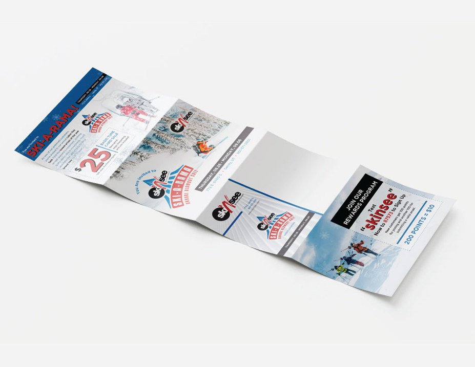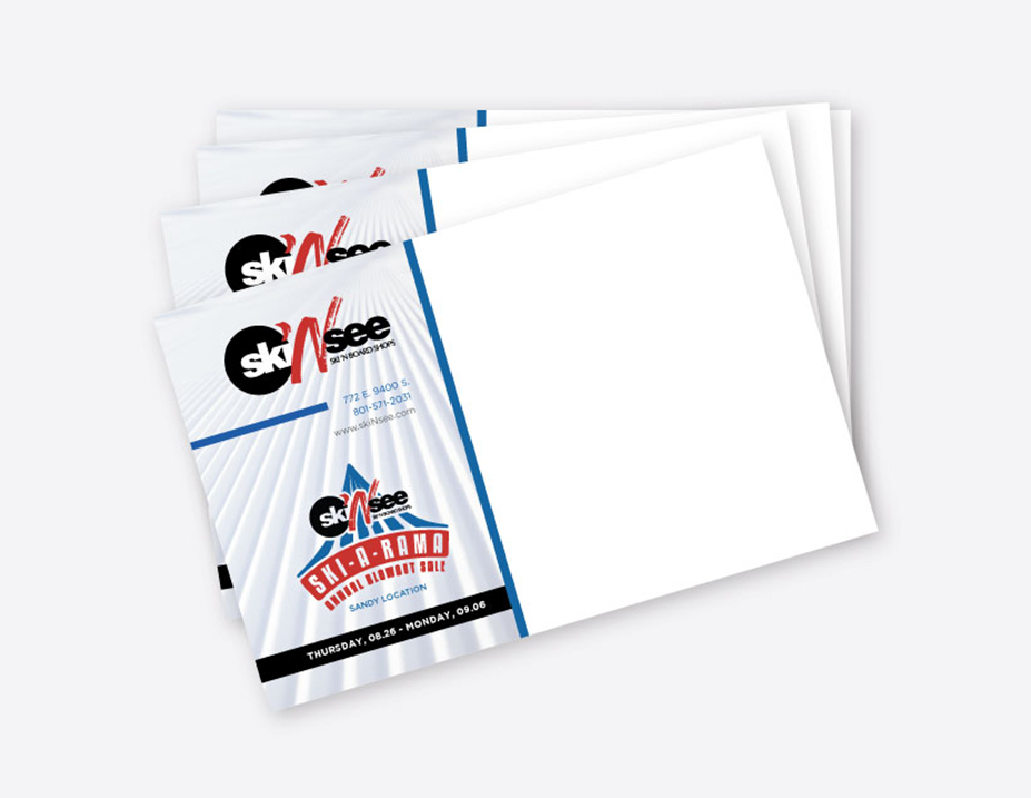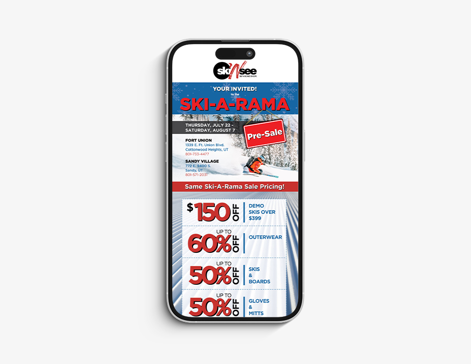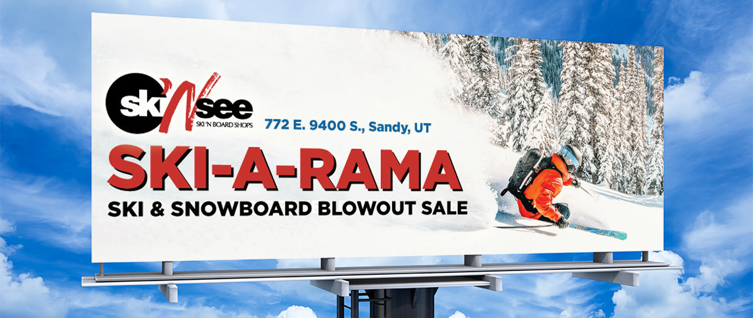 - Annually, Ski 'n See hosts a large summer sale to clear out surplus inventory from the previous year. To promote the sale, I created a variety of assets across print, digital, and CRM channels to build awareness and, in turn, increase foot traffic. Deliverables include a quad-fold direct mailer, digital billboards displayed on major highways across Salt Lake City, direct-to-consumer event emails, and event week signage. As a result of this advertising effort, foot traffic to the sale increased by 20% compared to the previous year, leading to the best year of sales.