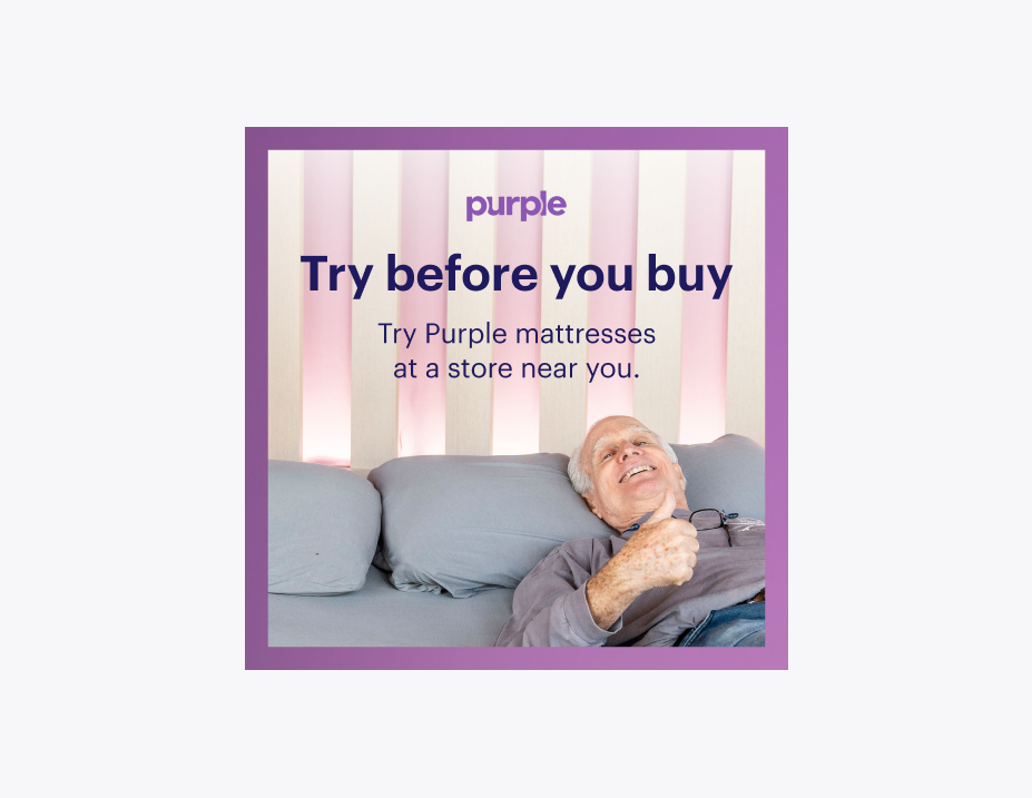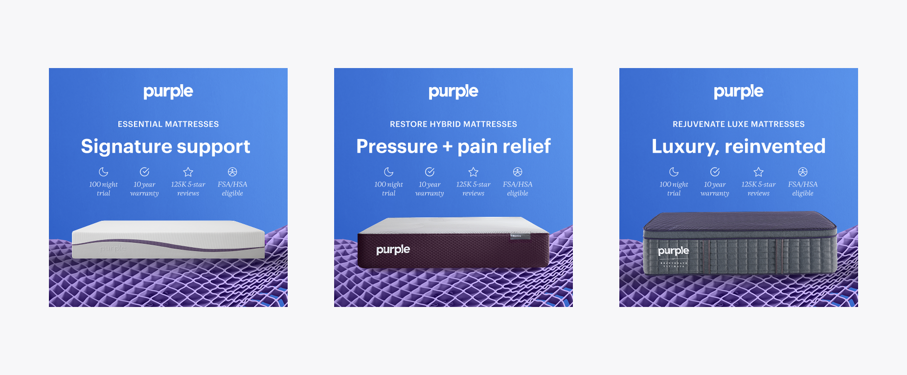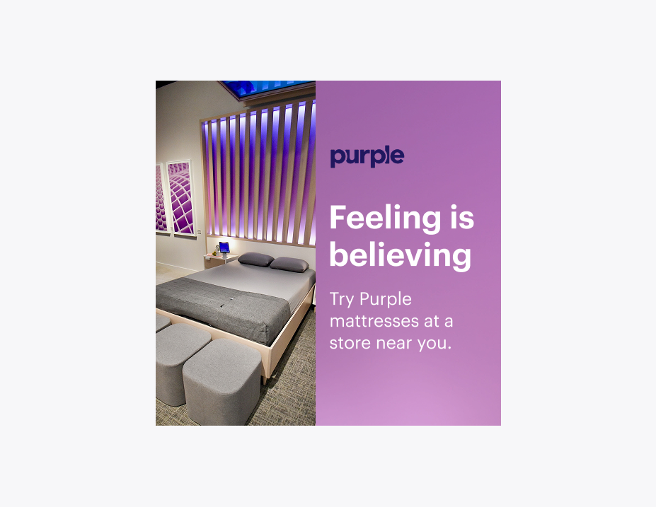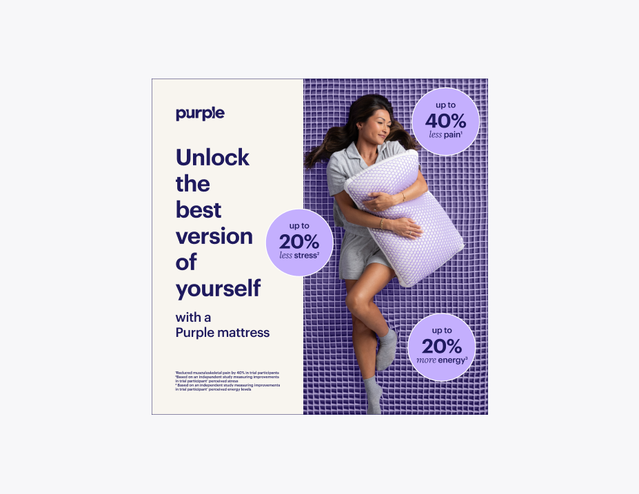 - One of my responsibilities at Purple is to develop high-impact static and motion paid media ads across Meta, Snapchat, Pinterest, and Reddit. These campaigns highlight current promotions, evergreen brand messaging, and drive-to-store initiatives. Through ongoing testing and optimization, my creative work has consistently improved performance metrics, increasing both ROAS and CTR.
